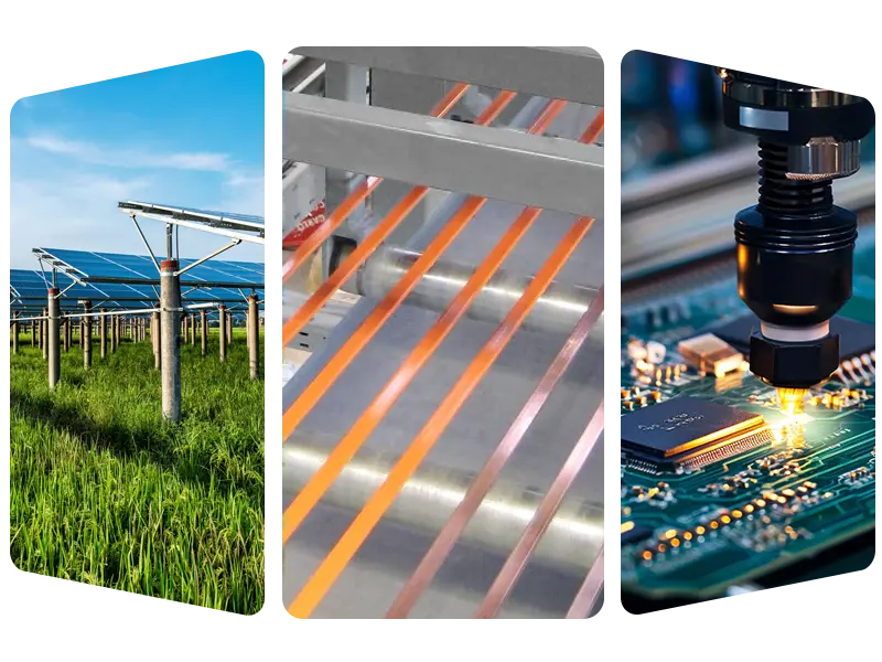 • Fotonaponsko polje: masovna proizvodnja fotonaponskih traka za zavarivanje i sabirnica koje pomažu komponentama da efikasno provode električnu energiju.
